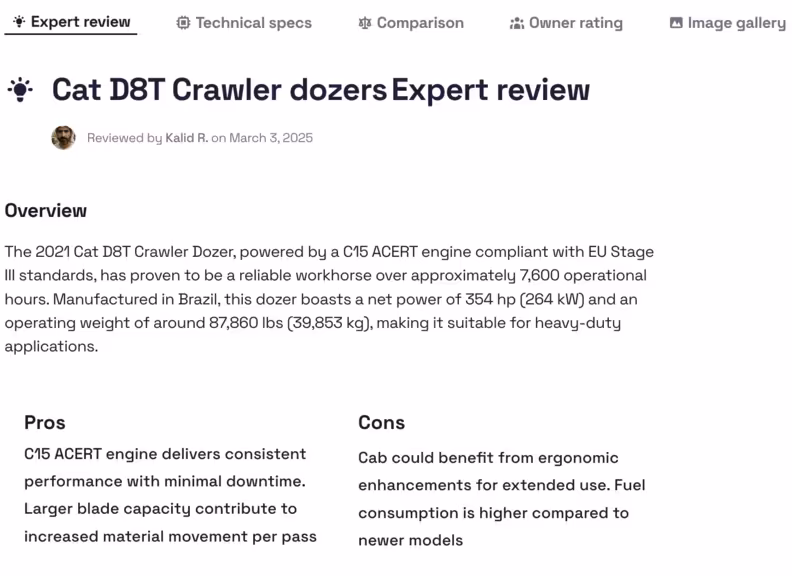 قبل أن تستثمر في حفارة صغيرة مثل كاتربيلر 303E أو جرافة مثل كاتربيلر D8T، استعرض مراجعات الخبراء. قد توفّر عليك الكثير من المال والوقت والقلق، وتمنحك ثقة حقيقية في قرارك.