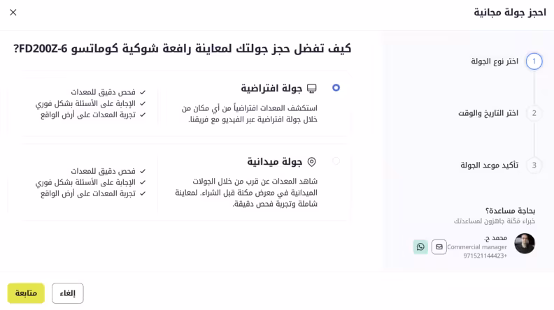 يُمكن حجز جولة فحص معدات ثقيلة عن بعد (ثلاثية الأبعاد). تواصل مع فريقنا.