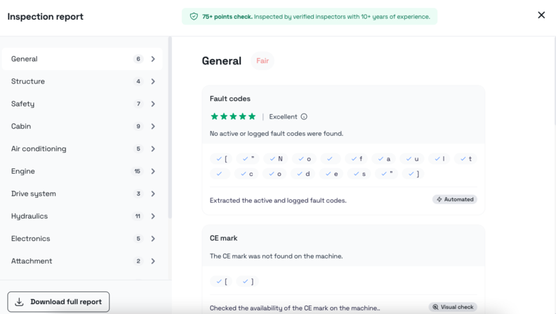 في مكنة، يقوم خبراء الفحص لدينا، الذين يملكون أكثر من 10 سنوات من الخبرة، بفحص كل آلية وفقًا لأكثر من 75 نقطة فحص. يشمل الفحص عداد الساعات، وأداء المحرك، والأنظمة الهيدروليكية، وحالة التآكل. نوثق كل التفاصيل بالصور عالية الدقة والتقارير المفصلة والفيديوهات التشغيلية، وكل ذلك من قبل فريق مكنة دون الاعتماد على أي جهة خارجية.