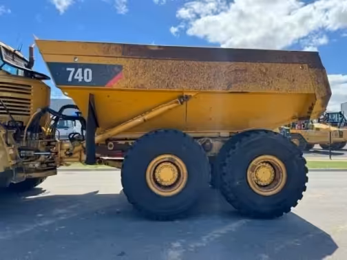 شاحنة Cat 740 المفصلية (2006–2025) تقع ضمن فئة الـ40 طن؛ سهلة الاعتماد، قوية، ومع محرك C18، تسع حوالي 38 طن مع صندوق بسعة 23 م³.