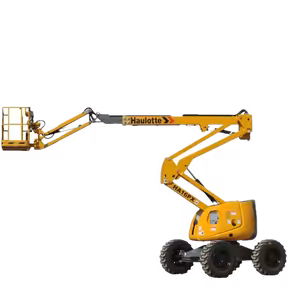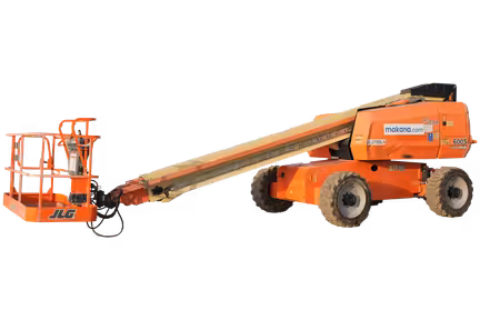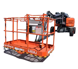 رافعة Skyjack SJ63 AJ (2013–2020) المفصلية ذات الوزن الثقيل (~9.6 طن)، ارتفاع العمل ~21.2 م، المدى العرضي ~12.2 م، وعرض ضيق (~2.44 م) بدون ذيل. سعة 227 كغ، دفع رباعي، قادرة على السير حتى وهي مرفوعة—مصممة لتظل تعمل بينما يتوقف الباقي.