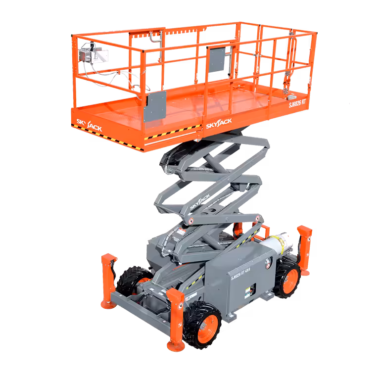 رافعة Skyjack SJ6826 RT هي مختصة بالتضاريس الصعبة؛ ارتفاع العمل يصل إلى 9.92 م، العرض 1.76 م فقط، وسعة التحميل 567 كغ (431 كغ للمنصة القياسية + 136 كغ للتمديد) . مدعومة بمحرك ديزل (أو مزدوج الوقود)، وتتحرك بالكامل حتى وهي مرتفعة—قوية، ذكية، ومستعدة للعمل دون توقف.