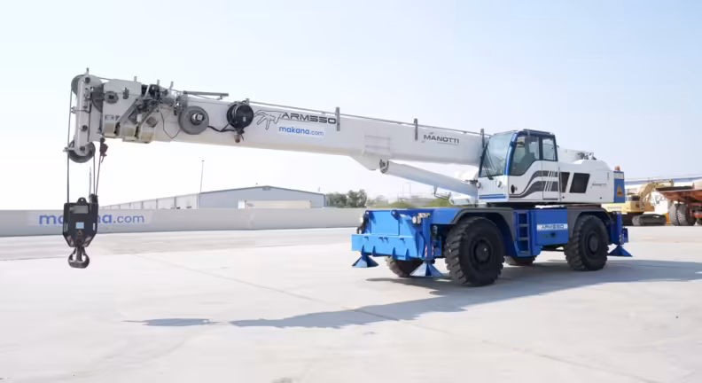 The used Manotti ARM 550 is an Italian-built rough terrain crane with a 55-ton lifting capacity and a 35-metre maximum lifting height. Manufactured in Italy, it is built for construction, industrial, and infrastructure projects that require stable lifting performance on rough and uneven ground across UAE sites.