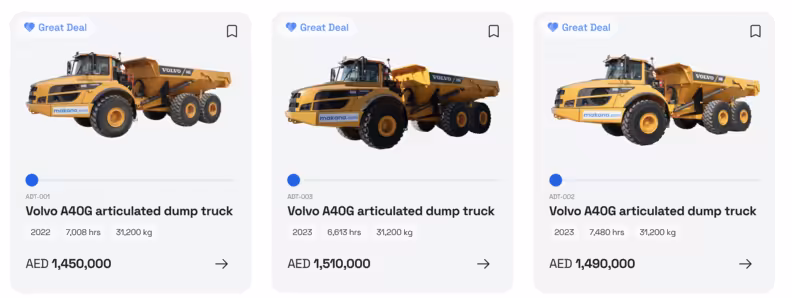 Makana.com currently lists three used Volvo A40G units, 39,000 kg payload, all in excellent condition, ready for work and export. Each unit includes: