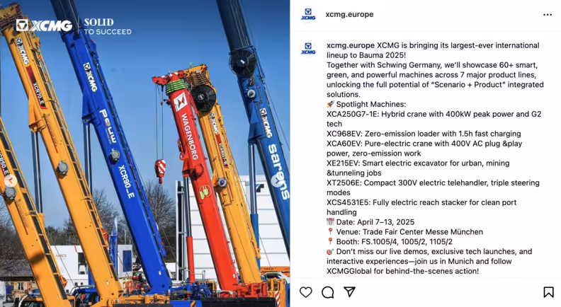 At Bauma 2025, XCMG introduced the XE215EV, a 25-ton electric crawler excavator powered by a 400 kWh LFP battery with up to 8 hours of operation. They also showcased BYD battery swap technology for zero-downtime recharging on-site and emphasized fleet-wide battery standardization across their electric equipment.