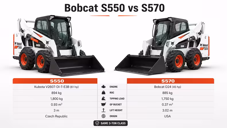 Bobcat S550 and Bobcat S570 are both 3-ton skid steer loaders built for compact site work, but they are different machines with different strengths. The S550 carries a larger bucket and higher tipping load, while the S570 reaches a slightly higher lift point. Picking the wrong one for your job can cost you time and money every day.