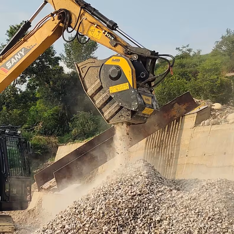 A bucket crusher is a jaw-style crusher mounted on an excavator arm. It processes demolition debris such as concrete and brick into reusable material directly on site.