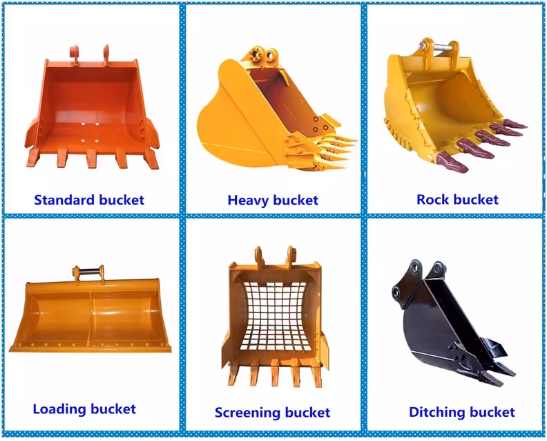 Digging buckets: Fitted with sharp teeth and reinforced edges for general excavation in soil, clay, or gravel.