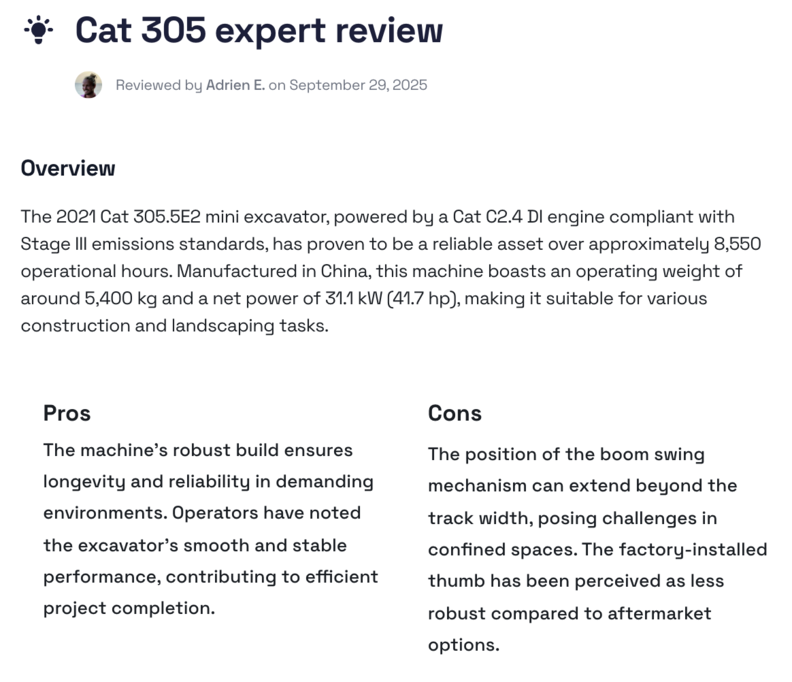 Technical data alone doesn’t tell the whole story. That’s why Makana’s Research section also includes Expert Reviews written by professionals who have directly operated or inspected the machines.