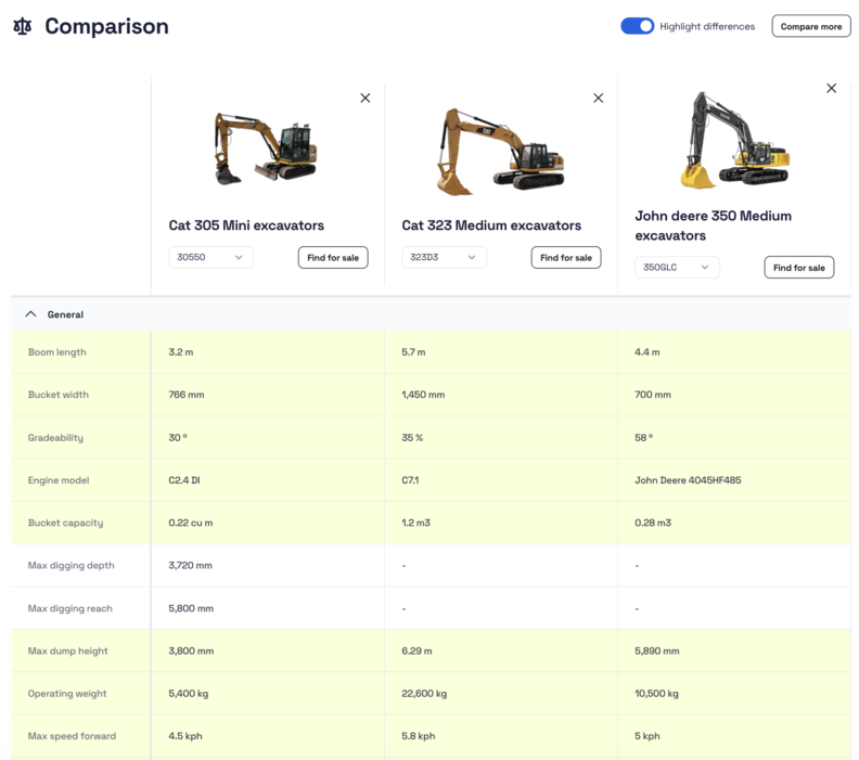 Compare up to five machines from the same category (excavators - loaders - dump trucks…etc).