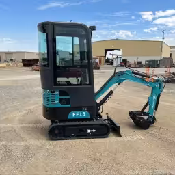 Classified as a 1-ton mini excavator, the FF13 offers usability upgrades—fully enclosed cab, fan, lighting, and practical accessories like toolbox and thumb control. Fuel tank ~6.6 L, travel speed ~3 km/h.