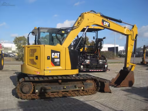 The Cat 308 CR is a compact-radius mini excavator weighing ~8,387 kg (min) to ~9,380 kg (max with extras), powered by a 51.8 kW (69.5 hp) C3.3B Tier 4 Final engine. Dig depth tops out at 4.64 m with load-sensing hydraulics for smooth and efficient digging.