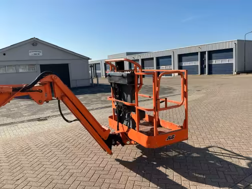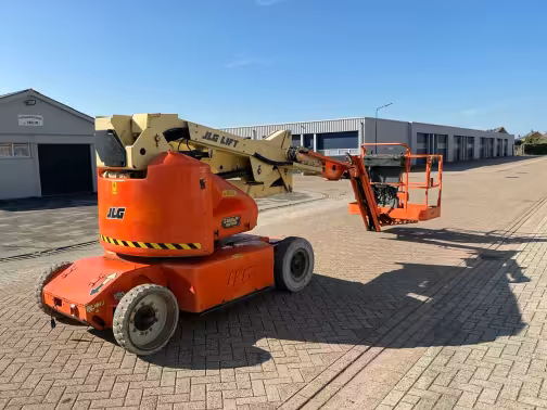 The E400 is built for electric boom lift use in constrained or emission-sensitive environments. It runs on a 48 V battery system with zero emissions and quiet operation. It features boom articulation, a jib option, and full 360° swing (non-continuous). Its drive and gradeability are suitable for jobsite movement but not extreme terrain.