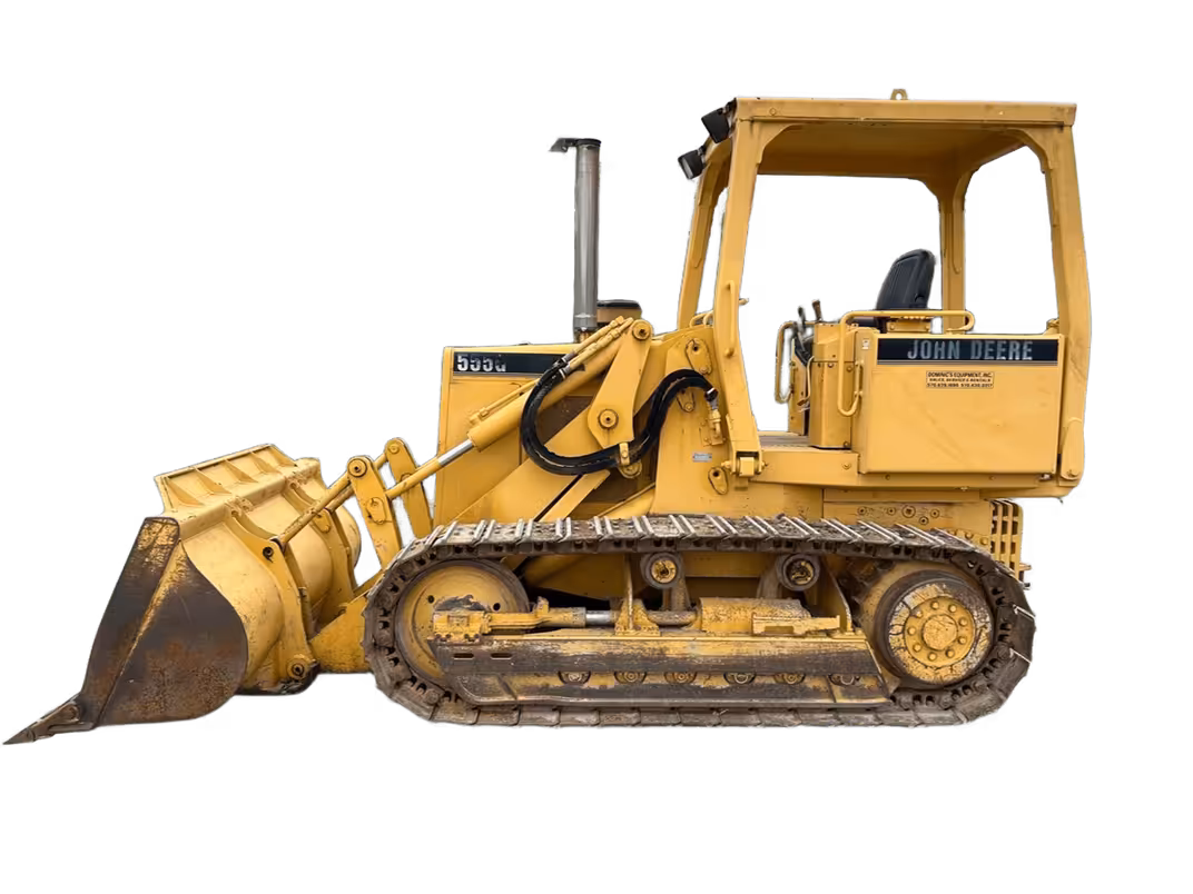 The John Deere 555G (1988–2021) is a crawler loader designed for grading, pushing, and material handling on soft terrain. Powered by a 4045T turbocharged diesel engine producing 397 Nm of torque, it delivers strong traction and dependable loading capability.
