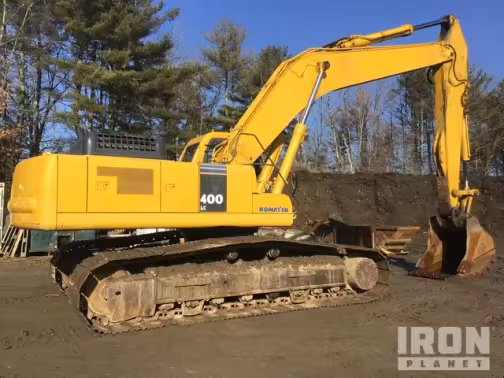 The PC400-8 (2007–2014) weighs ~47.1 t and uses a 257 kW SAA6D125E-5 engine. It digs to 9.255 m and reaches 13.18 m, with transport dimensions of ~11.905 m × 3.64 m × 3.265 m.