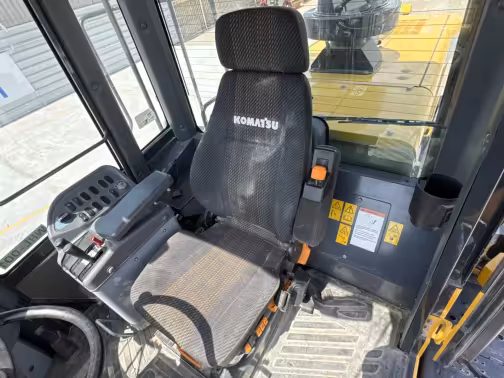 Cab is classic Komatsu-functional, roomy, and straightforward. Visibility is wide, with large glass panels and side mirrors that actually help. Controls are old-school physical toggles and buttons: tactile, quick to use, and placed where you expect.